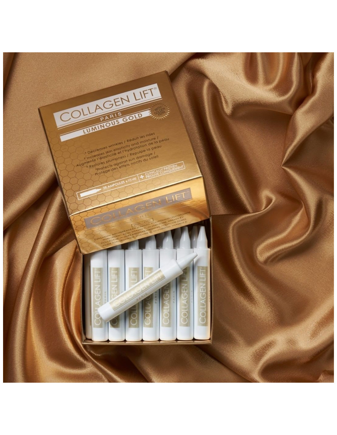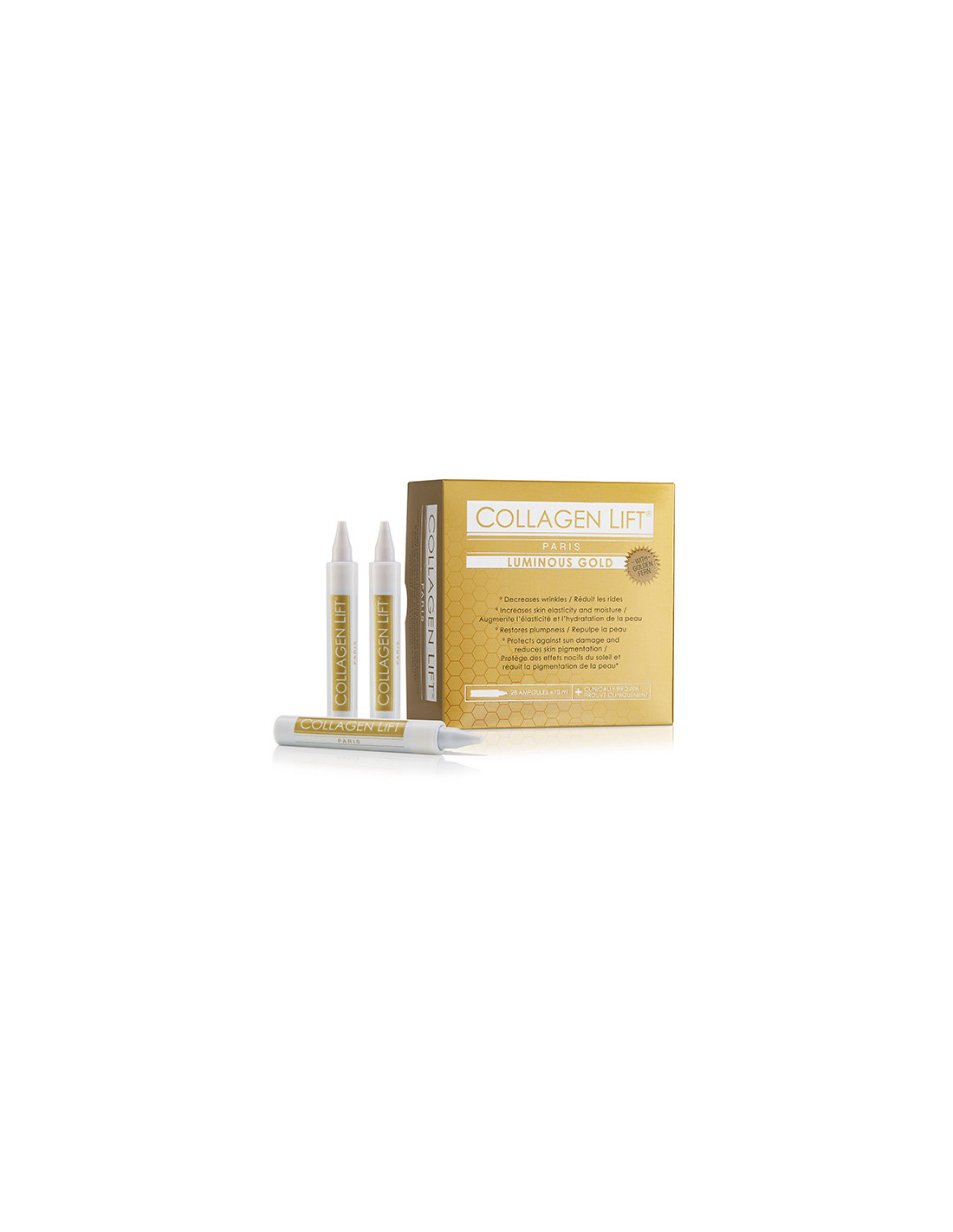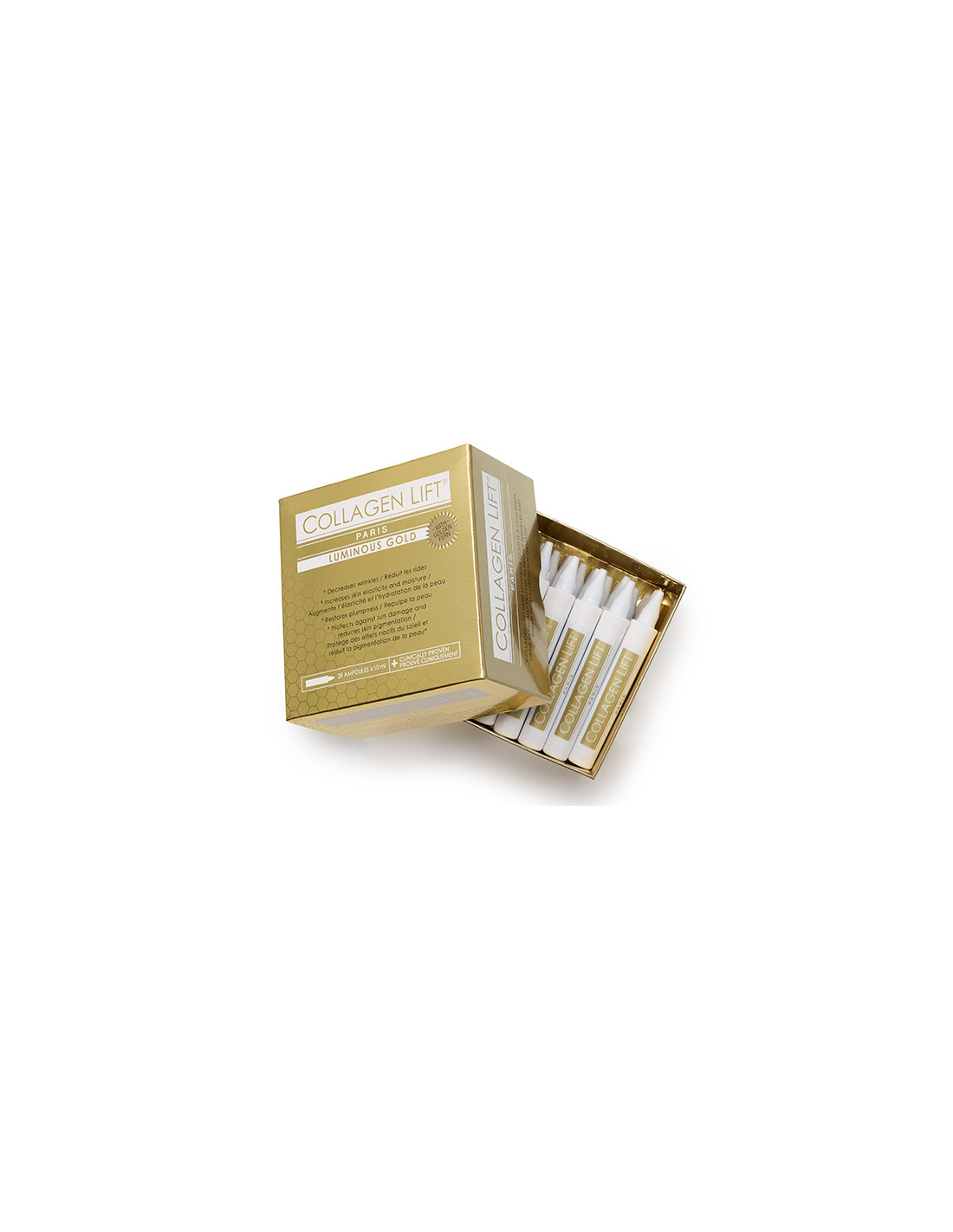 COLLAGEN LIFT PARIS LUMINOUS GOLD je prémiový tekutý doplněk stravy v 28 ampulích, navržený pro intenzivní podporu zářivé pleti a celkové vitality, se zaměřením na pigmentaci a známky stárnutí způsobené sluncem. Obsahuje hydrolyzovaný kolagen Verisol® B, extrakt z mořské řasy Ulva Lactuca, silný antioxidant Polypodium Leucotomos, kyselinu hyaluronovou, vitamin C, vitamin E a L-Glutathion. Tento klinicky ověřený produkt je bez palmového oleje, vegetariánský a bez přidaných cukrů, což z něj činí luxusní volbu pro ty,